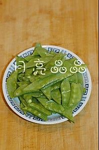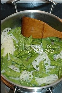 倒入荷兰豆一起翻炒至呈碧绿色。