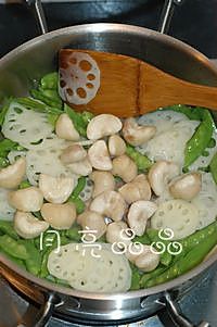 藕片捞出沥干水份。锅中放油烧热,把藕片放入快速翻炒几下,边炒边加点清水。