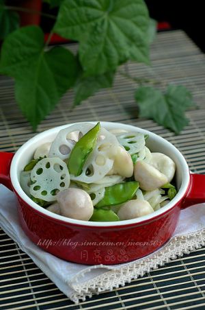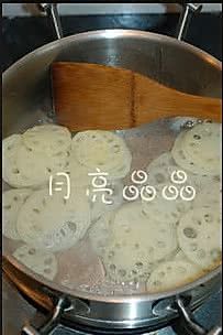 藕洗净去皮切成薄片,清水里滴些白醋,把藕片泡在白醋水中。