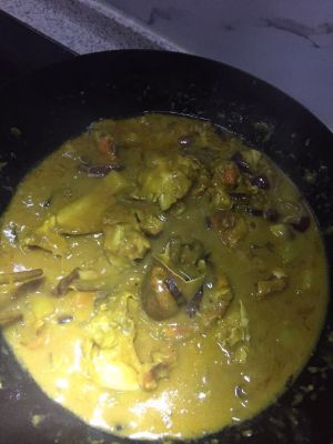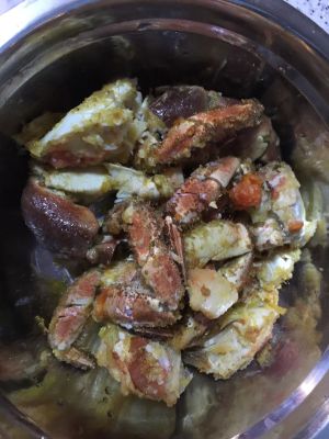 装盘。有个小技巧,蟹壳在炒土豆的时候下下去炒红了就夹起来放在一边,最后盖在蟹的身上。装盘才好看。