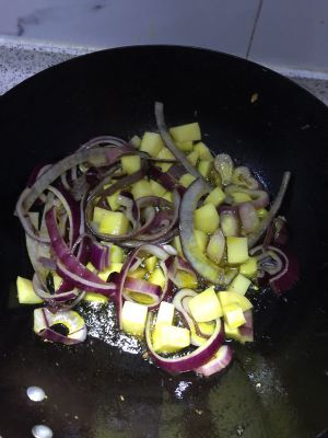 再下洋葱和土豆块翻炒。