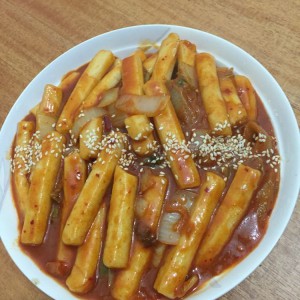 翻炒均匀后加水!水量刚刚没过年糕就好!加一点盐和糖调味!也可以先试一下汤味!够咸就不用加盐了!中小火!