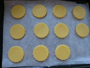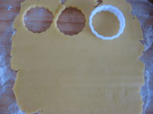 冻好的面团取出后用擀面杖擀成4mm厚的面片,用饼干模具压出形状,我这里用的是直径4.5cm的圆形切模。周围剩下的面团团在一起,再次冷藏到变硬,然后再擀再切。