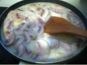 将蘑菇鸡肉及汤汁倒入锅内,加一勺盐搅匀即可