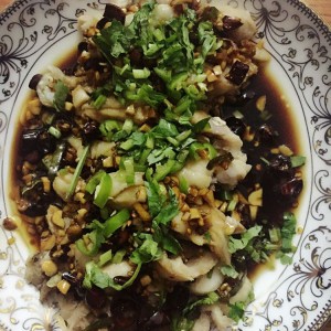 把鸡腿切块备盘,把调好的酱汁浇在鸡腿上,撒上葱花香菜末,完成!