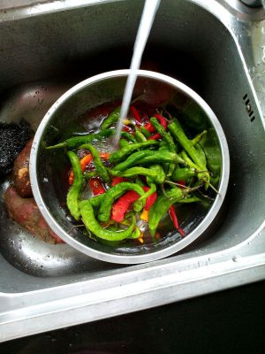 乡下拿来的辣椒都有点干,不要紧,洗洗干净。