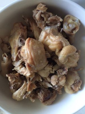鸡肉冷水下锅,过血水,捞起洗净,切几片老姜,和洗净的鸡肉放入高压锅,倒入适量料酒,加适量水,压7—10分钟(我压十分钟鸡肉比较耙)捞起,煮鸡肉的水留着,有用。