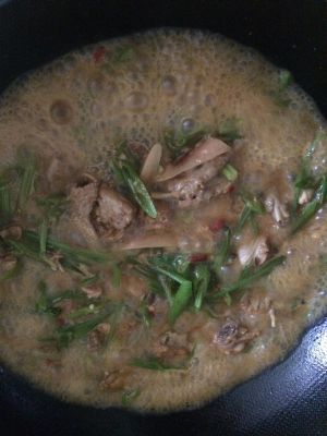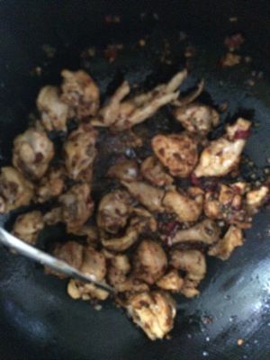 热锅下油,放入姜末,青花椒,郫县豆瓣酱,老抽炒香(记住一定小火,不然你们的姜末也会变成我这样,一个人又拍又炒,时间久了点,就黑了)然后放入鸡肉,稍炒一会儿混匀。