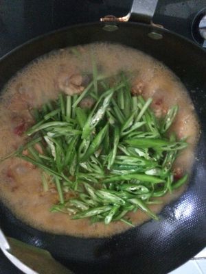 然后加入芹菜段,喜欢辣的可以加点辣椒,配料里忘记写了,这个可以根据自己口味定,也可以放莴笋。
