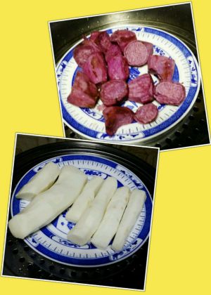 山药、紫薯削皮,上蒸锅蒸30分钟蒸熟