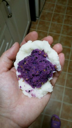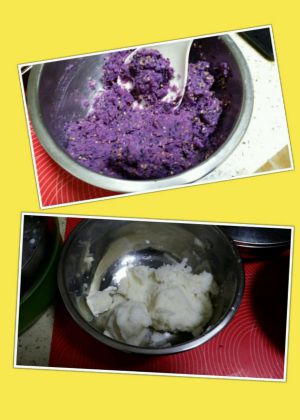 把山药和紫薯碾成泥,调入牛奶,芝麻,糖桂花,白糖,搅拌均匀