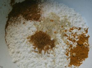 面粉加盐 五香粉 孜然粉 咖喱粉,只要你愿意可以加你喜欢的调味料~搅匀