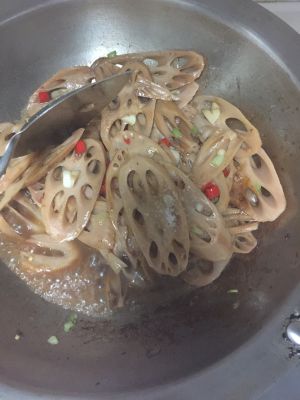 加老抽,生抽,鱼露,醋,一点点糖以及开始留下的煮藕的卤水,翻炒均匀,让其入味上色都均匀。
