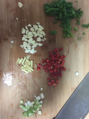 准备好辣椒,姜,蒜,葱切碎。