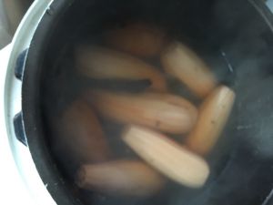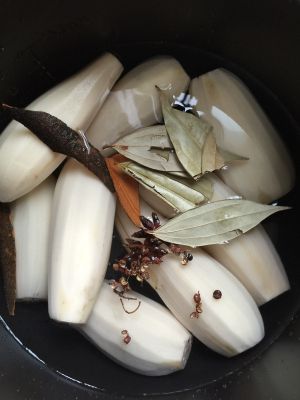 藕去皮洗净放入电饭煲中,加入花椒八角桂皮月桂叶香料,加水盖过藕,开启清香炖模式。