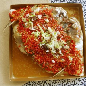 将拌好的剁椒平铺到盘子中的鱼头上;