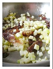 放入腊肠片和土豆丁,翻炒至腊肠变为透明薄片 。