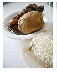 土豆去皮洗净,切小丁儿, 东北大米淘洗干净,浸泡30分钟 。