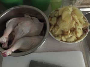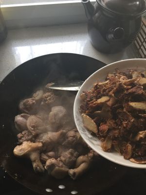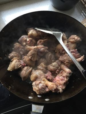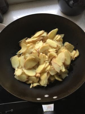 翻炒均匀后,加入米酒大海20毫升。熬制一会去鸭肉的醒味,加入姜