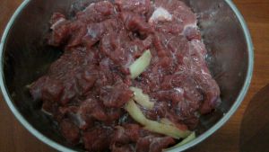用盐、姜、番薯粉、花生油腌制牛肉10分钟