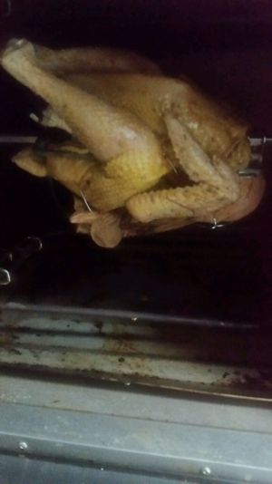 鸡腌制好了就可以开烤了,把泡发好的蘑菇加上蒜瓣塞进鸡肚子,把鸡捆绑结实了进入烤箱。低温120度1个半小时,然后涂抹蜂蜜水后一百180度上色。