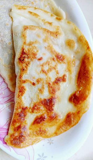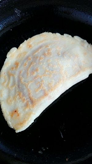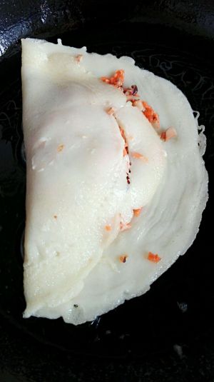 等面糊表面都凝固时把另一边折过来盖住馅料,如图!有裂开吧,没关系。我们用小勺舀面粉糊把有裂开的地方还有边缘都糊上!