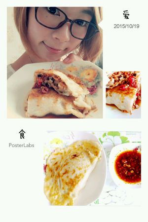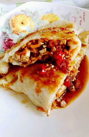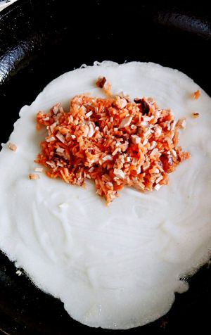 不粘锅放底油,油温不是很热的时候倒入一勺面糊,拿铲子将面糊均匀摊开 如图!在面糊的一边放上馅料(因为一会要把另一边折过来)