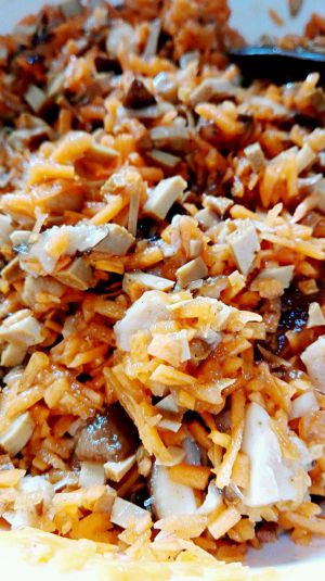 香菇剪掉有杂质的根(别都剪掉如图即可),清洗后热水抄一遍再放凉水里冲洗几遍,用手稍微挤压香菇挤出多余水分切丁备用。胡萝卜擦丝切丁备用。
