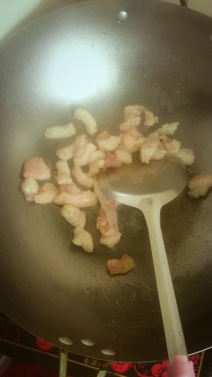 用刚才切出来的肥肉来炸油,有的锅会贴锅的,可先放一小勺花生油再炸,要是不贴可以不加