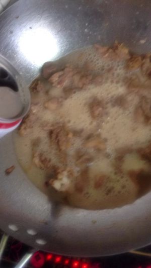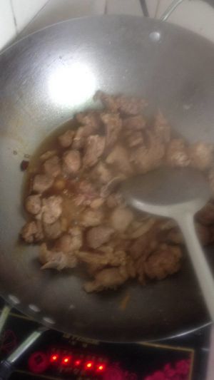 炒好后加入鸭肉一起炒几分钟后加入适量蚝油,酱油和老抽。