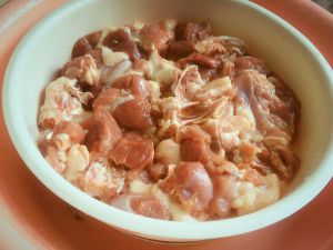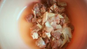 肥肉切出来后剩下的瘦肉加入盐和料酒腌20分钟,也不一定要那么久,赶时间10分钟左右也可以了