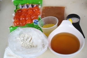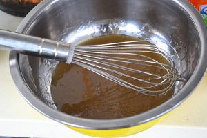 转化糖浆70g,碱水1g,花生油25g倒入盆里搅拌均匀。