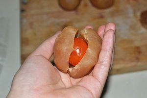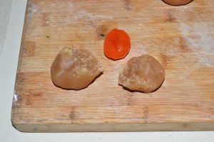 取一个蛋黄放在莲蓉馅的中间。