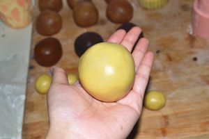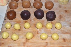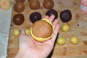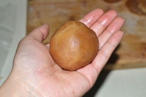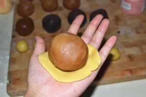 饼皮分成一个20g揉成团,莲蓉馅加蛋黄为80g揉成团。
