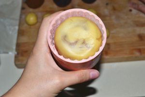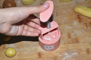 模子里撒些面粉,转一圈再倒出来,放入馅轻轻压扁。