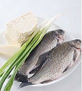 鲫鱼宰杀好,可以买的时候直接让店家杀好。去干净鱼鳞和鱼肚里的黑膜,彻底洗净,控干水份,可以用厨房纸擦干。豆腐切小块,姜切片,香葱打成结。