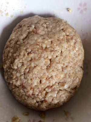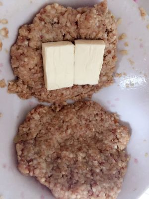 拍打排出空气后,分成两个肉饼。其中一个夹上芝士,两块肉饼再合在一起。团成一团。