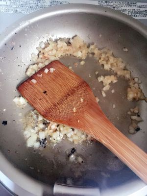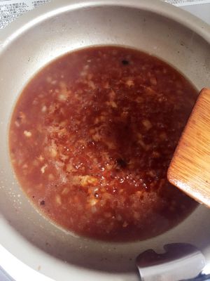接下来准备酱汁:直接用煎肉汉堡的锅翻炒剩余的洋葱末,然后加入水,酱油,糖,番茄酱,搅拌。