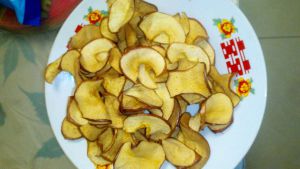 装盘,冷却。苹果片热的时候软的,要晾冷以后才会脆。图中的是两锅4个苹果的分量,被女儿吃掉一些,大概剩3个的分量。