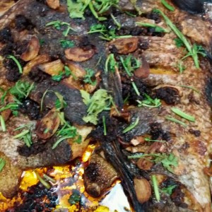 把葱 姜 蒜 蚝油 酱油 味素 咸盐 料酒十三香兑到一个大碗里搅拌好后 浇在鱼身上 腌制一小时以上以致鱼身和鱼腹内都入味才好