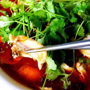 煮好的鱼肉和汤倒入盘中,撒些许葱花,锅中洗净,放入剩下的油,开小火放入剩余的辣椒段和花椒,轻轻翻炒变色就可以了,将油淋在盘中撒上香菜即可。