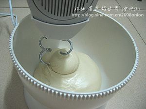 将发酵好的中种(A材料)撕成小块,混入B材料,用手工和成面团,放入祈和938S打蛋器内开启机器: 3分钟1档 + 3分钟1档 +(加小块黄油)3分钟1档(此时可拉出大片薄膜)+2分钟1档(完成)