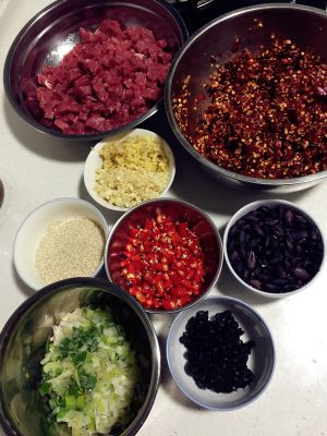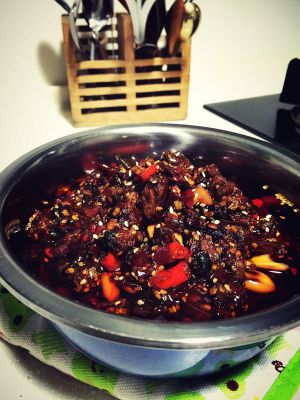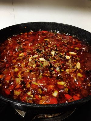 加入黄豆酱后,就开始漫长的熬制了,要经常翻炒,熬成小米辣不那么鲜艳,说明水份已经挥发(有水份很容易霉变,所以一定炒至挥发)