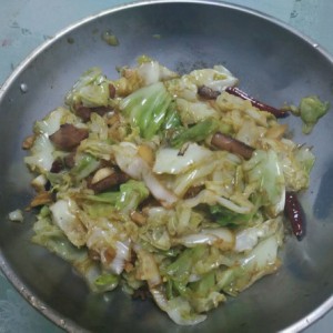 调大火,倒入包菜,翻炒,由于肥叉油多,所以我炒过程没添水(正常炒菜,偶尔边炒,边添水,继续炒,菜才不干也不易焦,水份足,)