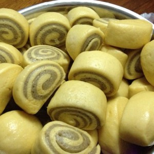 从一边卷起成条状,切成均匀的等份,蒸格刷一层薄薄的食用油防粘,把馒头胚放入蒸格发酵15分钟。