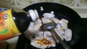 放入鸡翅,沿锅边倒入料酒,调入酱油,糖,翻炒均匀
