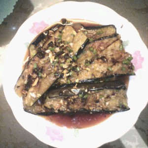 锅里倒油烧热,放入茄子,把两面都炸黄,炸熟