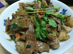 飞水的过程中~可以切洗辣椒和香菜和笋干~锅里面放油~放下捞起来的鸭肉~翻炒几分钟~