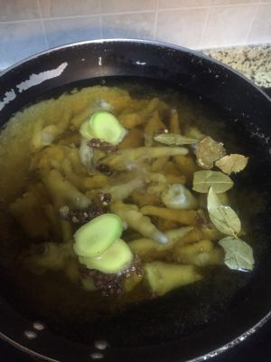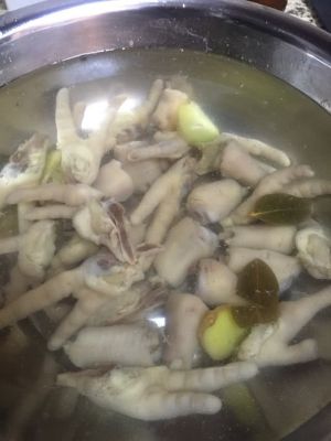 冲洗干净放入锅中,加水没过鸡爪,放入料酒、生姜、香叶、八角、花椒,大火烧开转小火烧10分钟。