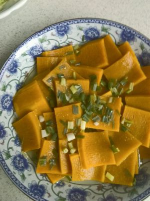 南瓜切片摆放在盘中,撒上少量的食盐,食用油,香葱